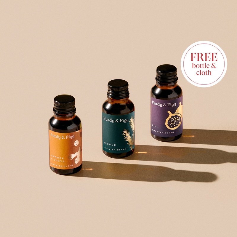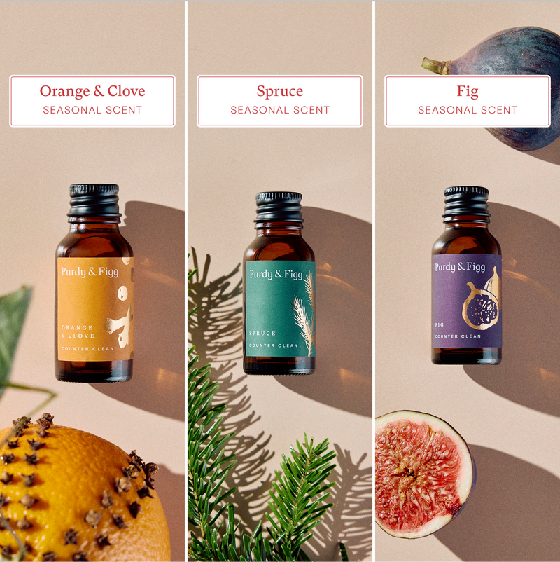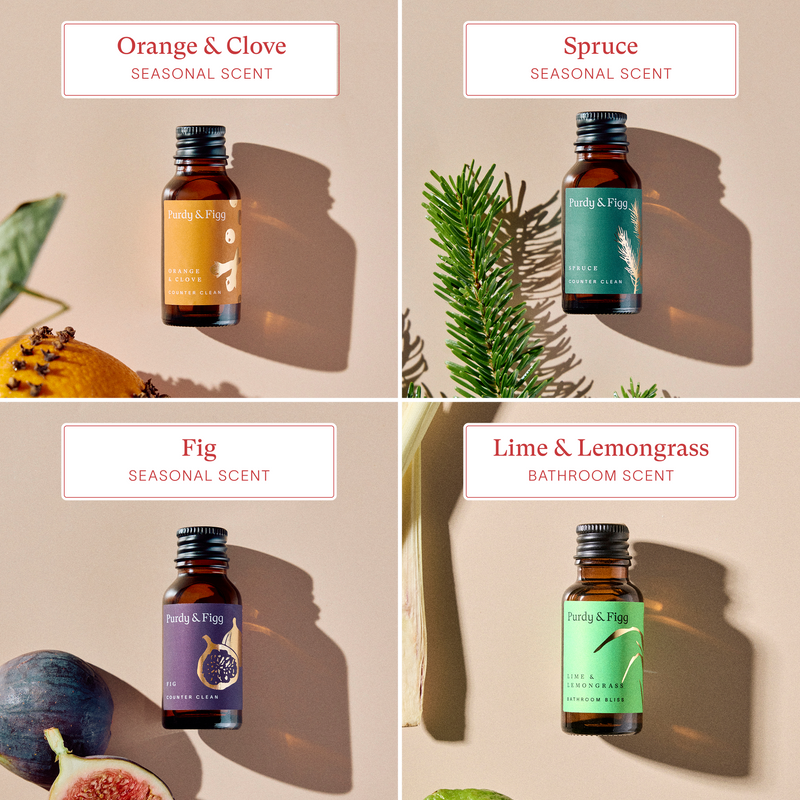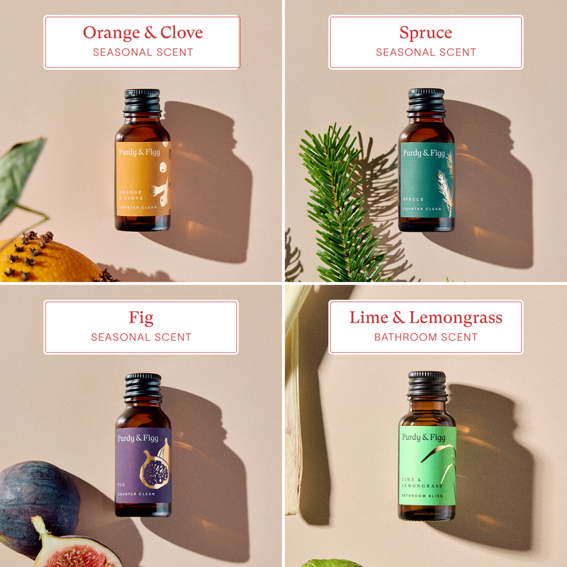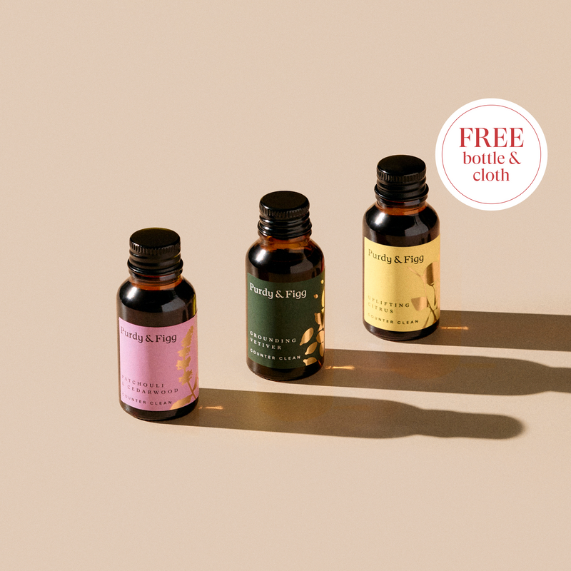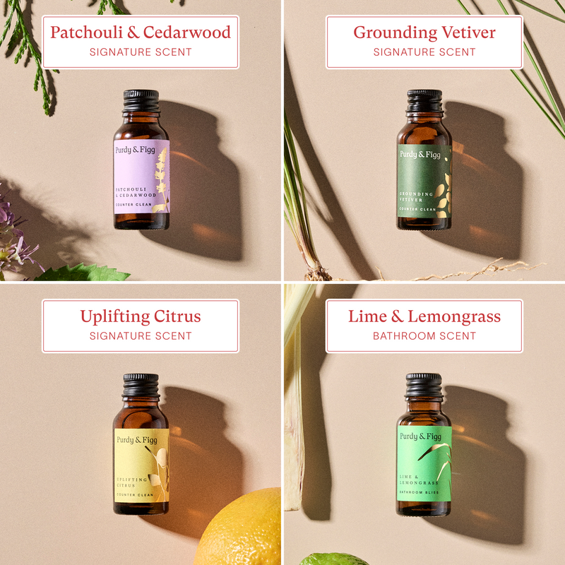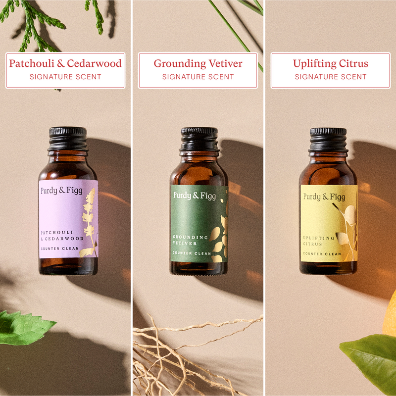 We offer two different scent collections with your Counter Clean subscription - Signature and Seasonal Scents. Our Signature Scent pack is available all year round, and contains our three best-selling scents - Uplifting Citrus, Patchouli & Cedarwood, and Grounding Vetiver. Our Seasonal Scent pack contains three limited edition new scents blended for every season.