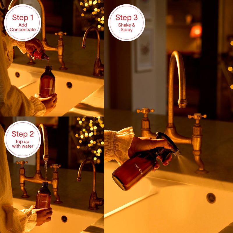 To use Counter Clean, simply pour the whole 20ml bottle of cleaning concentrate into your Bottle for Life and slowly fill to the top (just below the neck) with tap water. Give the bottle a gentle shake to mix, then enjoy your uplifting clean!