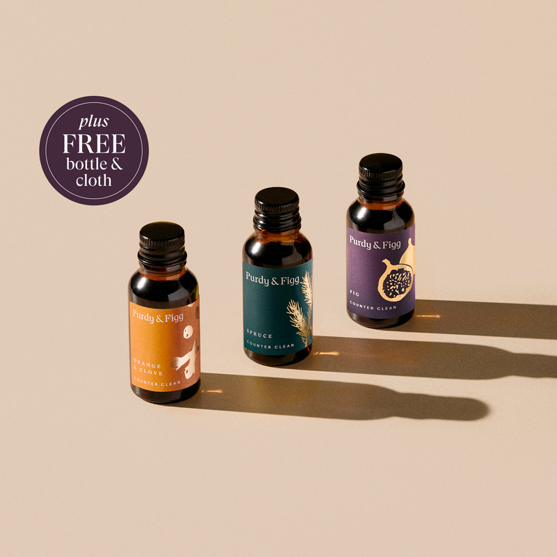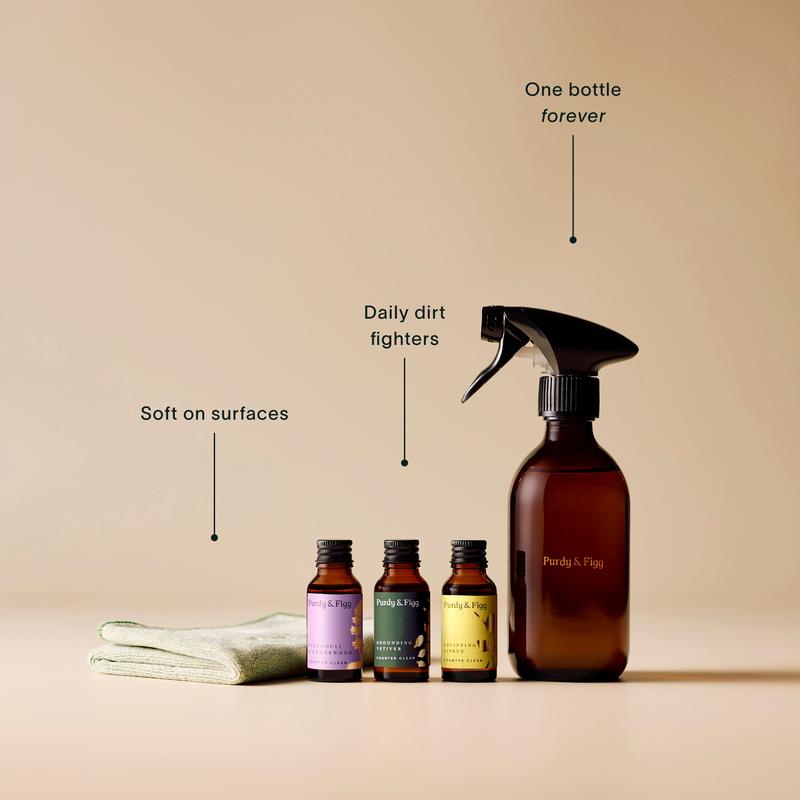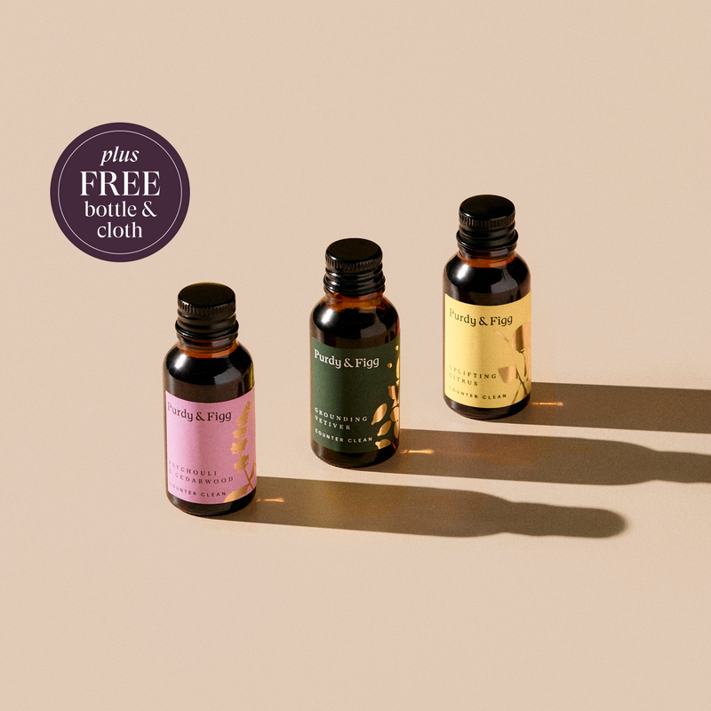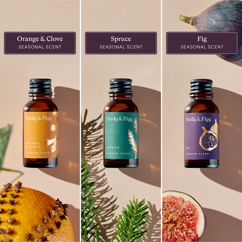 We offer two different scent collections with your Counter Clean subscription - Signature and Seasonal Scents. Our Signature Scent pack is available all year round, and contains our three best-selling scents - Uplifting Citrus, Patchouli & Cedarwood, and Grounding Vetiver. Our Seasonal Scent pack contains three limited edition new scents blended for every season.